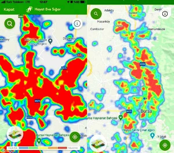 Bursa'da vaka sayılarındaki artış, Hayat Eve Sığar (HES) uygulamasına da yansıdı. Uygulamadaki verilere göre, kentteki vaka sayılarının özellikle son 3 ayda artmasıyla risk haritasının rengi, kırmızıya döndü.
