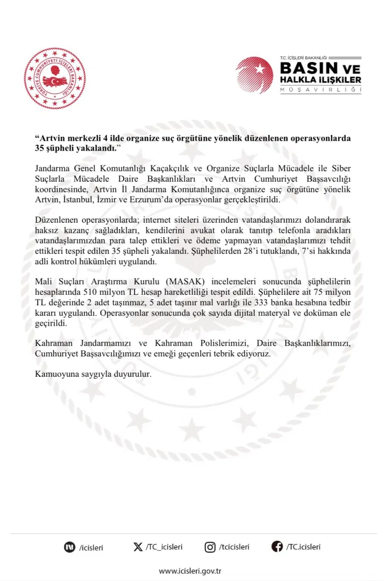 İçişleri Bakanlığı’nın koordinasyonunda Artvin merkezli 4 ilde düzenlenen operasyonda, internet dolandırıcılığı ve tehdit suçlarına karıştığı belirlenen 35 kişi gözaltına alındı. Şüphelilerden 28’i tutuklandı.