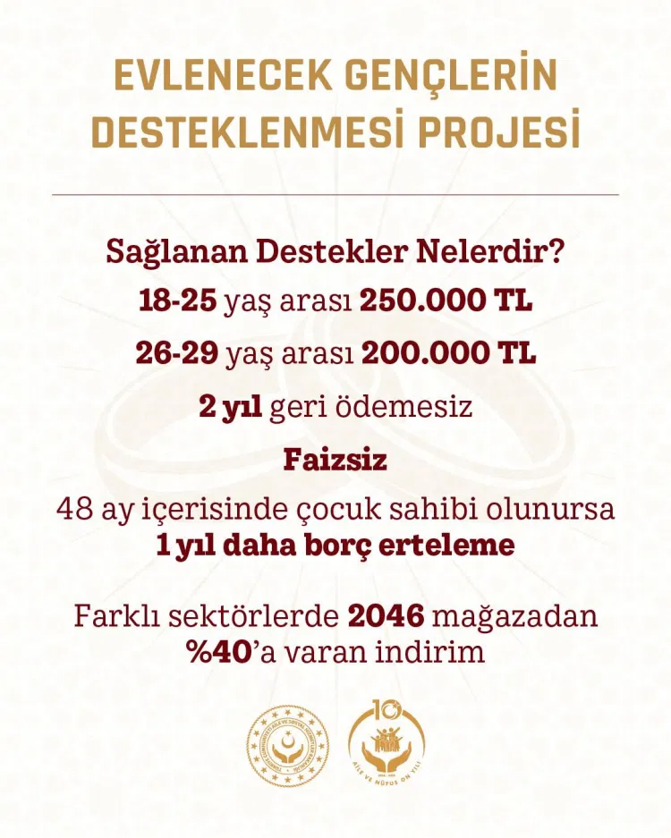 Aile ve Sosyal Hizmetler Bakanlığı, “Evlenecek Gençlerin Desteklenmesi Projesi” ile genç çiftlere faizsiz kredi ve çeşitli sektörlerde indirim desteği sağlıyor.