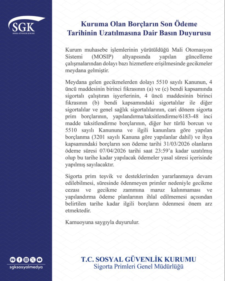 Sosyal Güvenlik Kurumu (SGK), Mali Otomasyon Sistemi (MOSIP) altyapısında yapılan güncelleme çalışmaları nedeniyle sigorta prim borçlarının son ödeme tarihini 7 Nisan 2026'ya kadar uzattı.